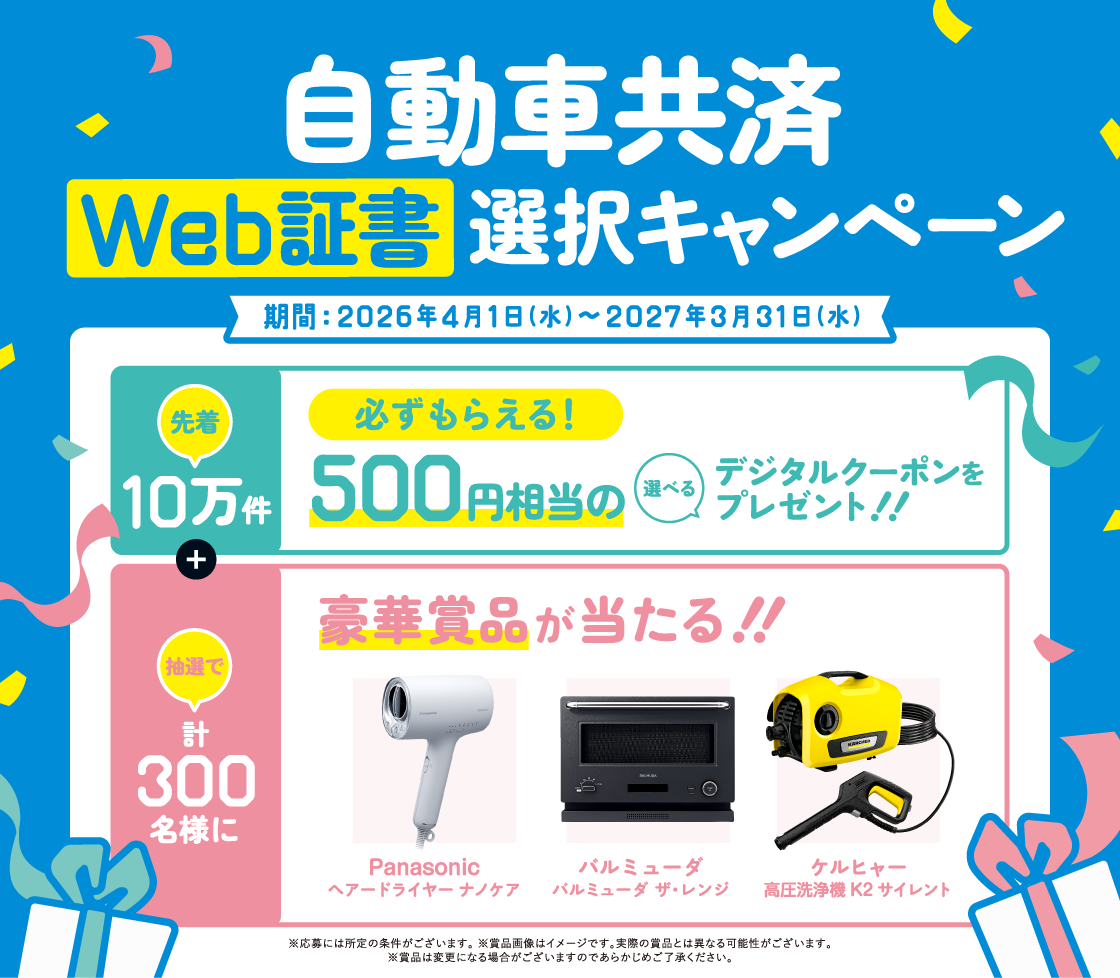 自動車共済の契約時または継続の際、Web証書を選択すると先着でデジタルクーポンをプレゼント!