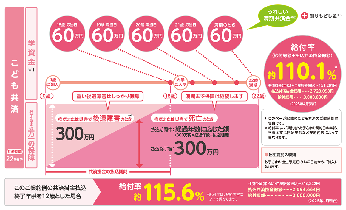 - 2 満期共済金は、22歳の誕生日の前日の属する共済年度の末日にお子さまが生存されているときにお受取りになれます(お受取りの時期は、お子さまの誕生日ではありません)。